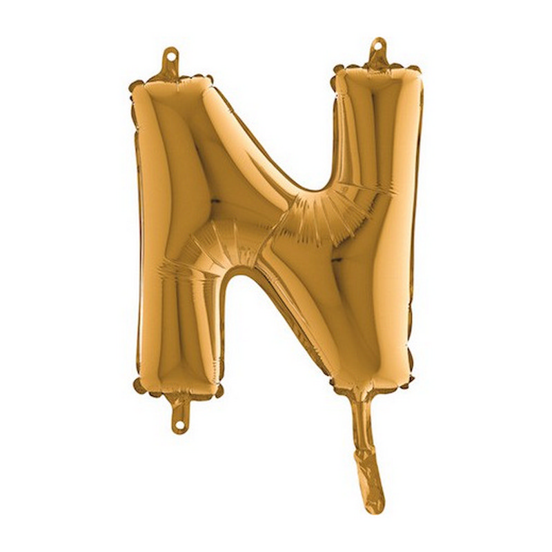 Foil balloon in shape of letter N in gold color. Balloons are in single pack.
