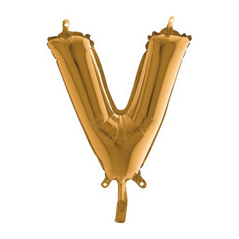 Foil balloon in shape of letter V in gold color. Balloons are in single pack.