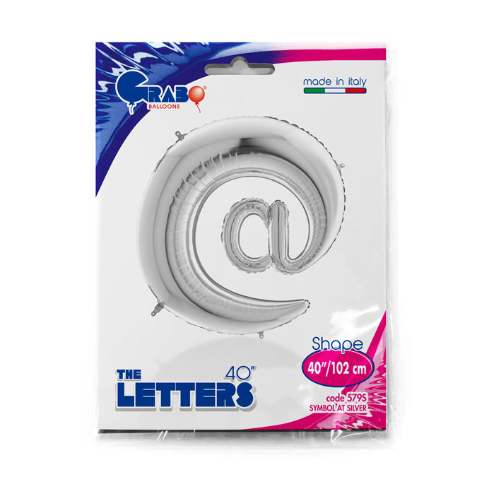 Foil balloon in shape of symbol @ in silver color. Balloons are in single pack.