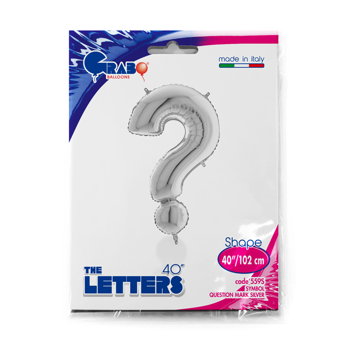 Foil balloon in shape of symbol ? in silver color. Balloons are in single pack.