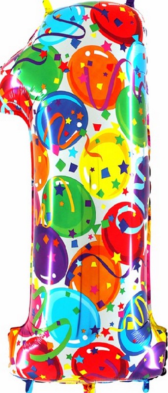 Foil balloon in shape of number 1 with balloons print. Balloons are in single pack.