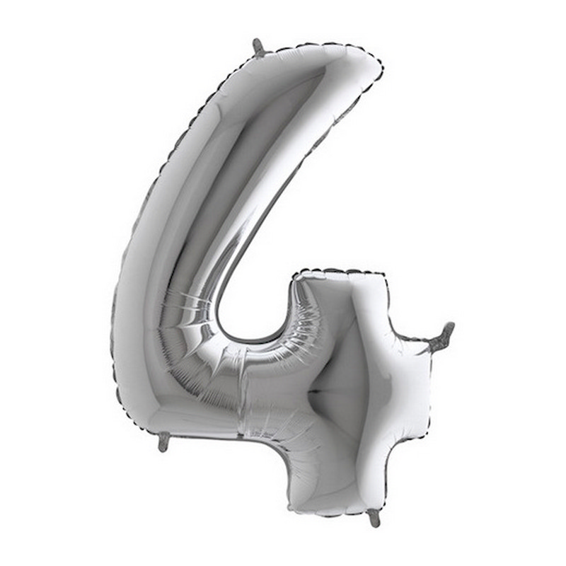 Foil balloon in shape of number 4 in silver color. Balloons are in single pack.