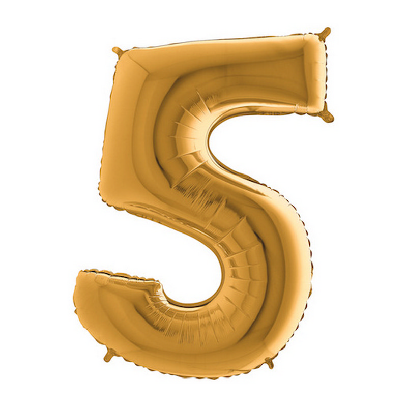 Foil balloon in shape of number 5 in gold color. Balloons are in single pack.