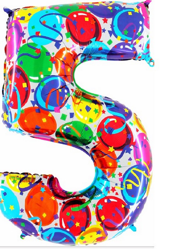 Foil balloon in shape of number 5 with balloons print. Balloons are in single pack.