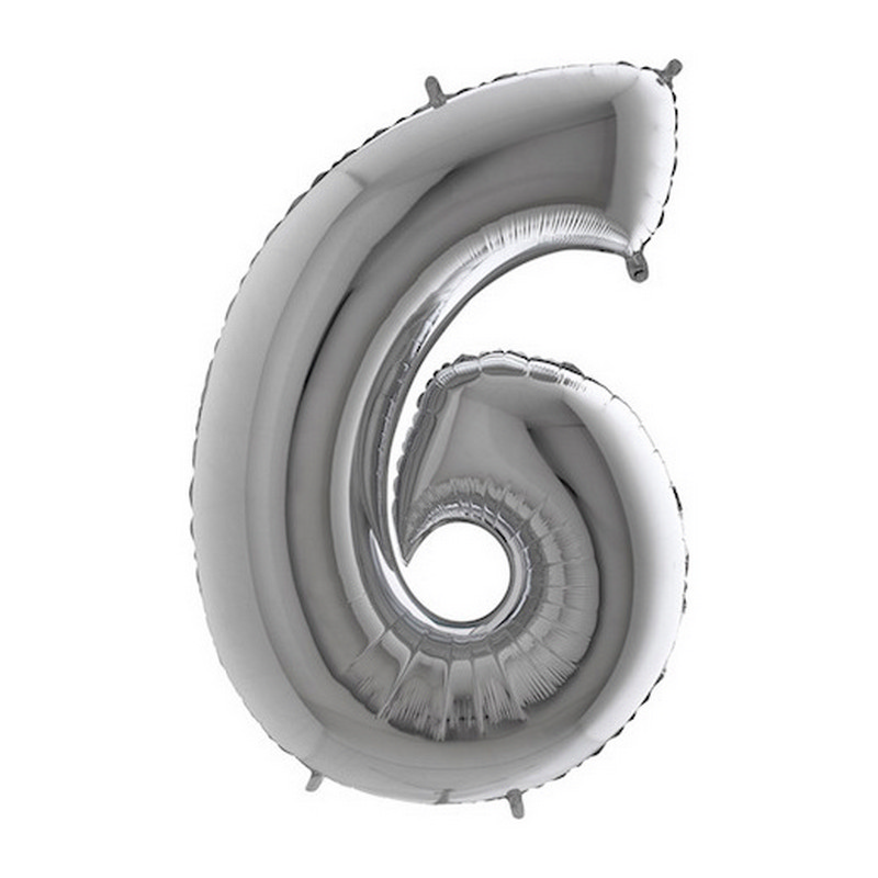 Foil balloon in shape of number 6 in silver color. Balloons are in single pack.
