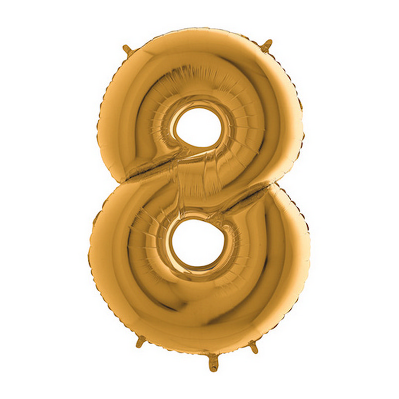 Foil balloon in shape of number 8 in gold color. Balloons are in single pack.