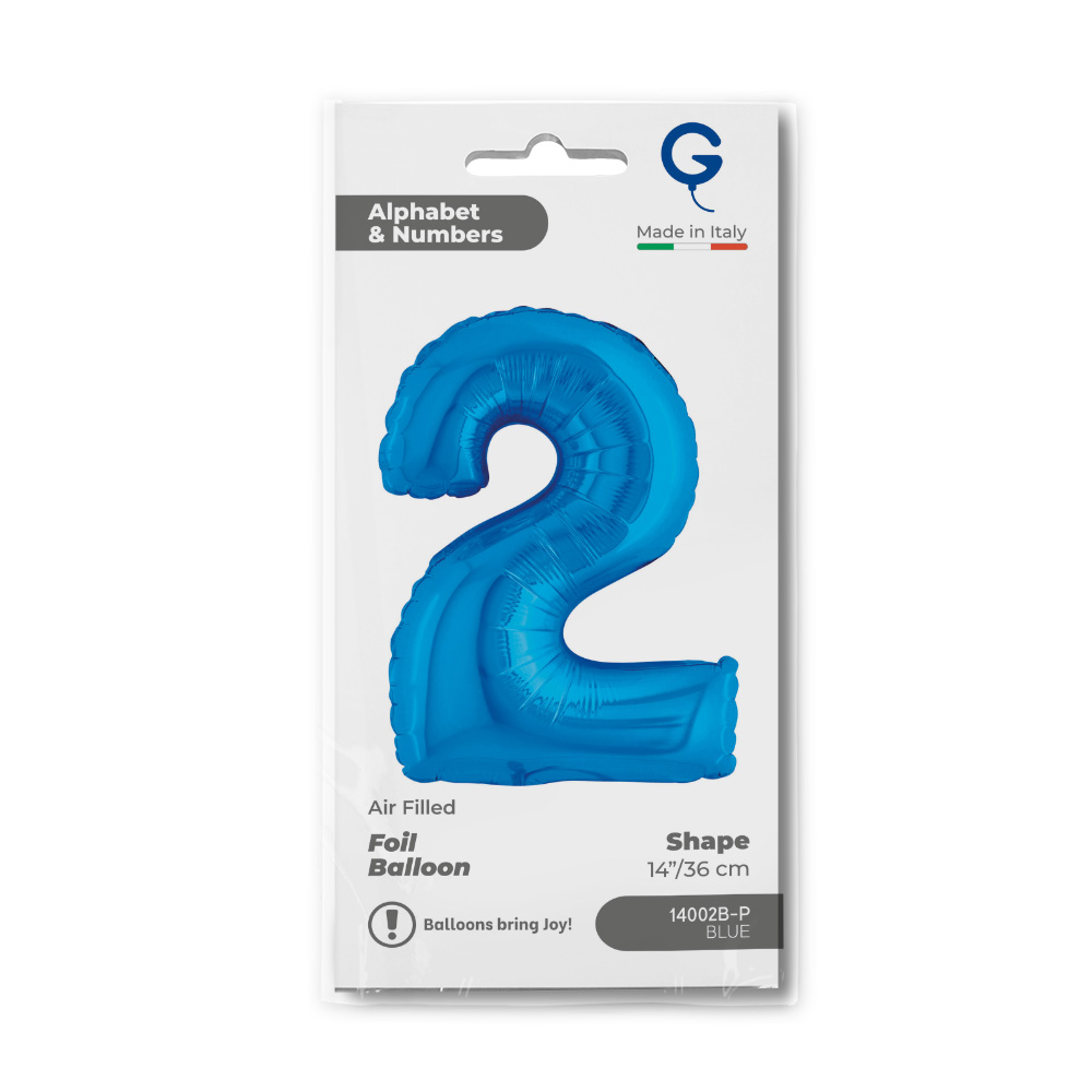 Foil balloon in the shape of the number 2 in blue color. Balloons are packed in retail packaging.