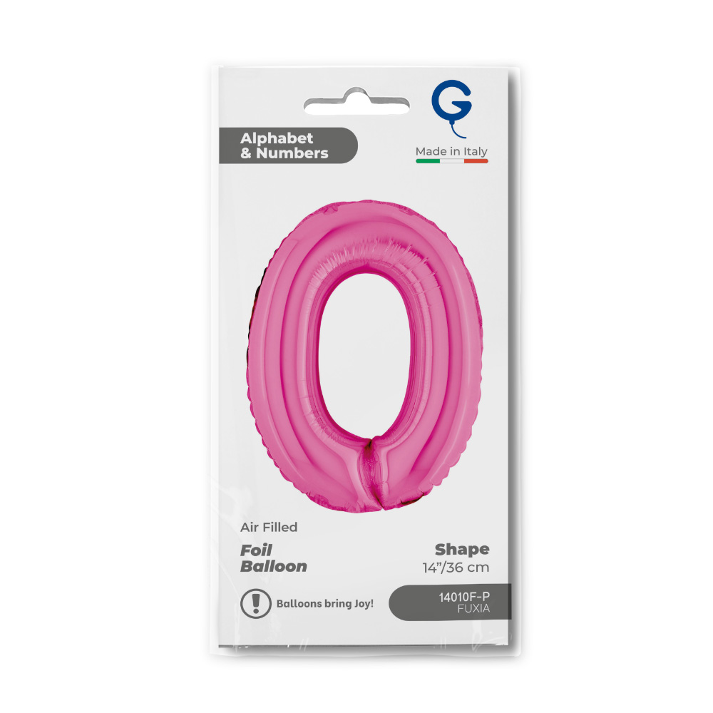 Foil balloon in the shape of the number 0 in fuchsia color. Balloons are packed in retail packaging.