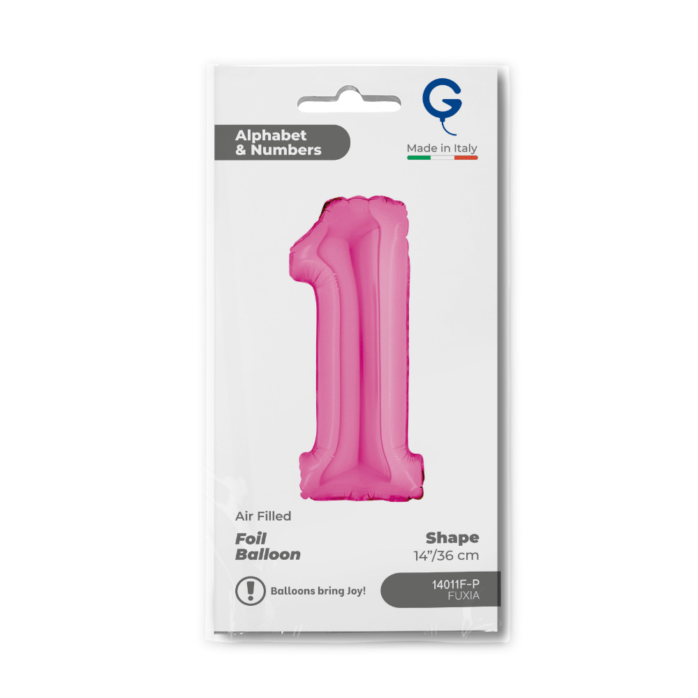 Foil balloon in the shape of the number 1 in fuchsia. Balloons are packed in retail packaging.