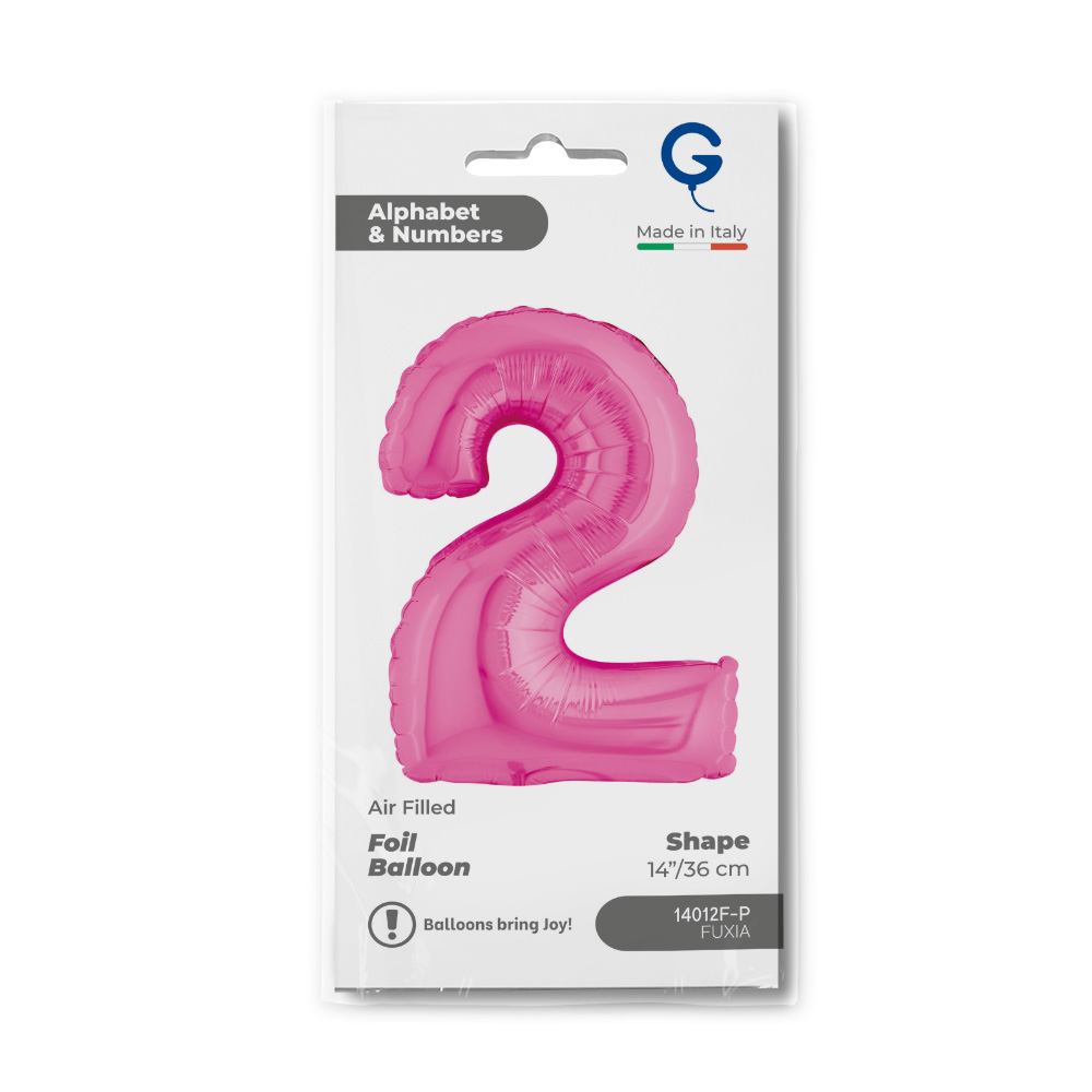 Foil balloon in the shape of the number 2 in fuchsia. Balloons are packed in retail packaging.