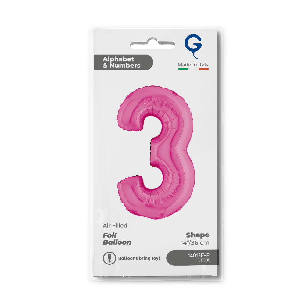 Foil balloon in the shape of the number 3 in fuchsia color. Balloons are packed in retail packaging.