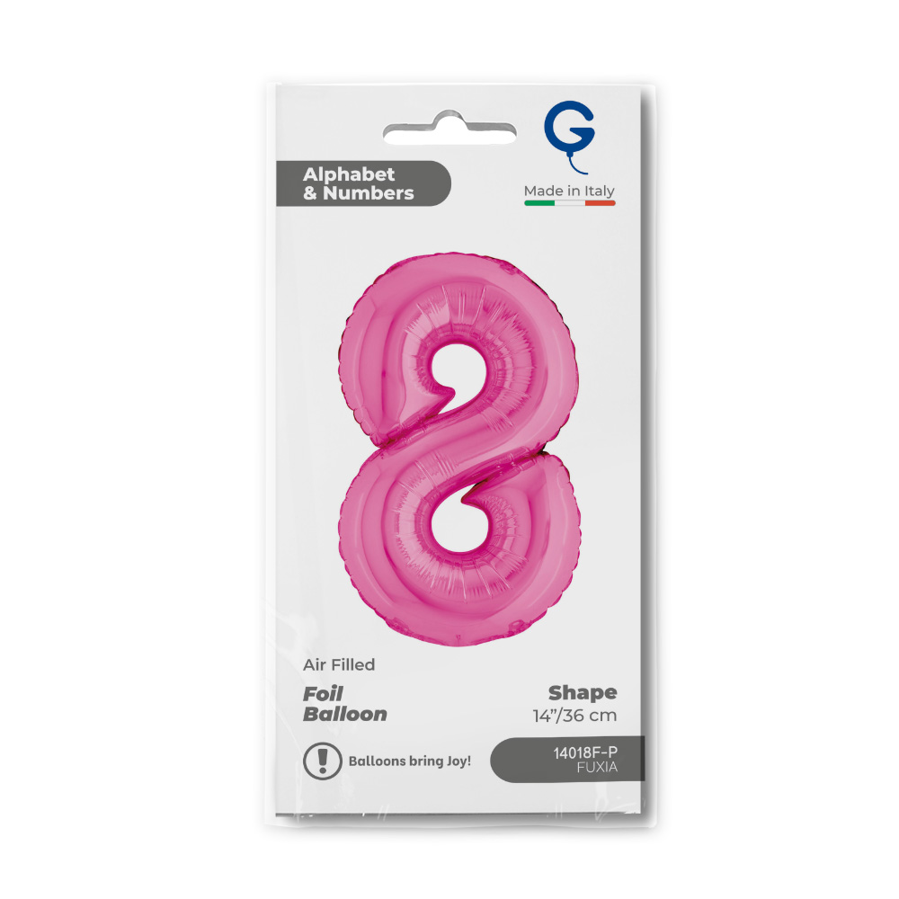 Foil balloon in the shape of the number 8 in fuchsia color. Balloons are packed in retail packaging.