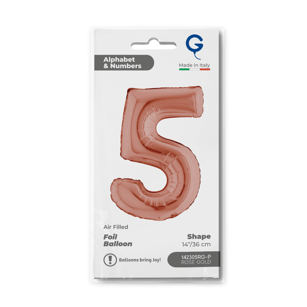 Foil balloon in the shape of the number 5 in rose gold color. Balloons are packed in retail packaging.