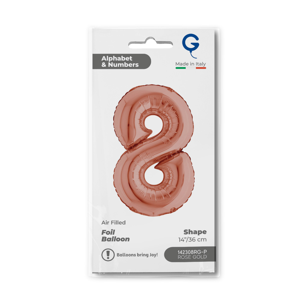 Foil balloon in the shape of the number 8 in rose gold color. Balloons are packed in retail packaging.