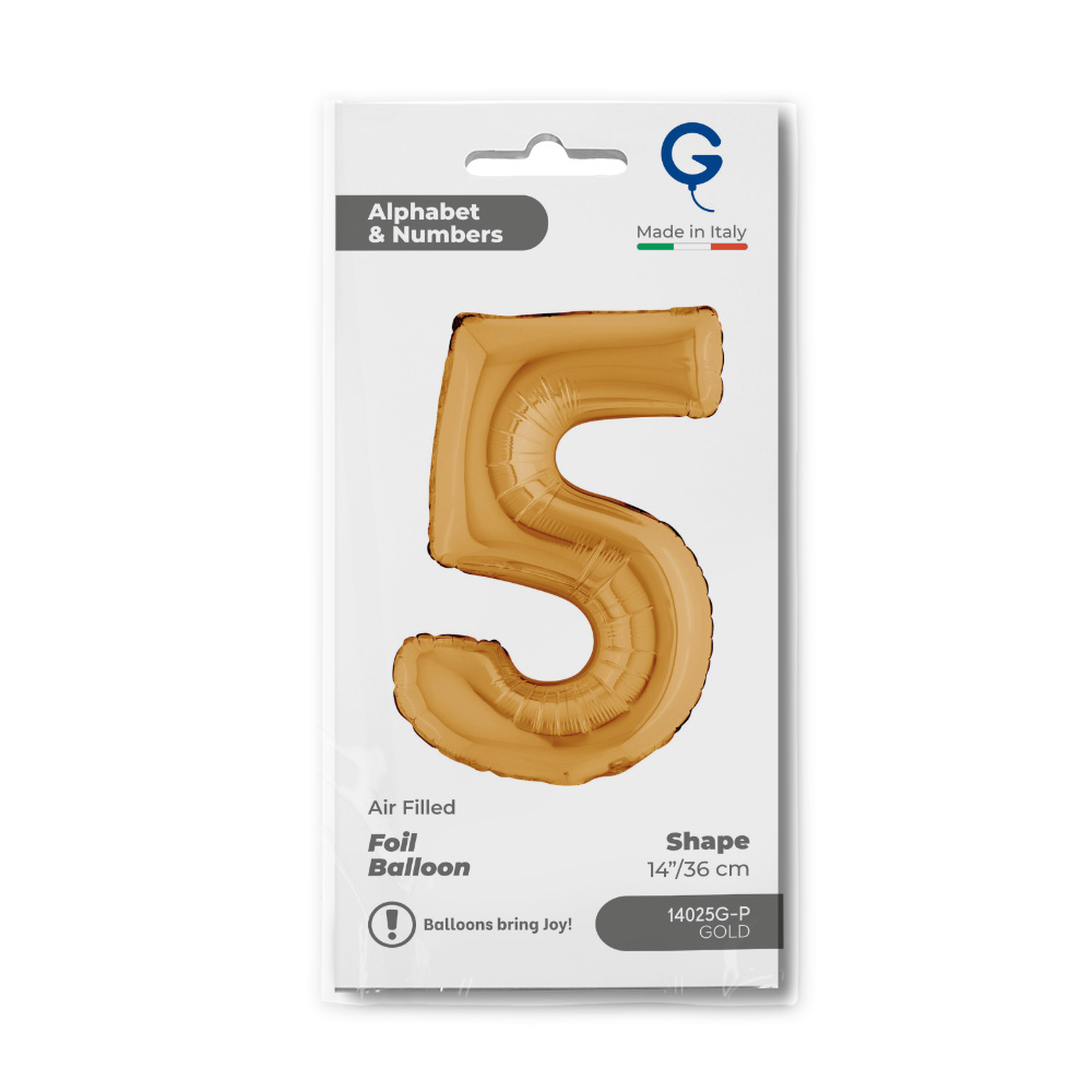 Foil balloon in shape of number 5 in gold color. Balloons are in single pack.