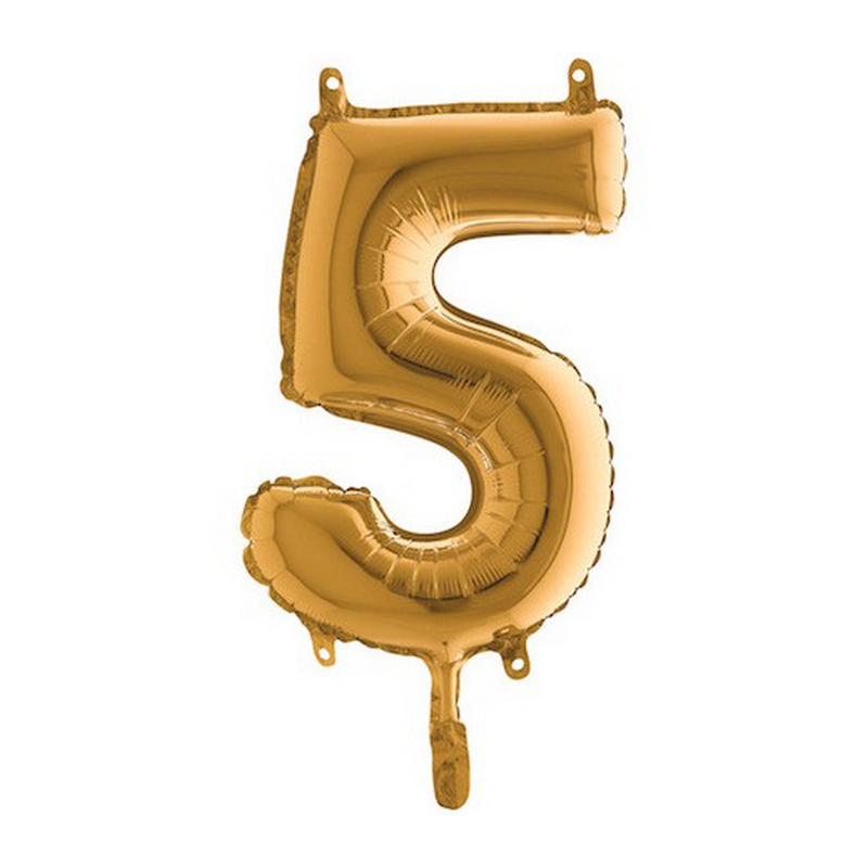 Foil balloon in shape of number 5 in gold color. Balloons are in single pack.