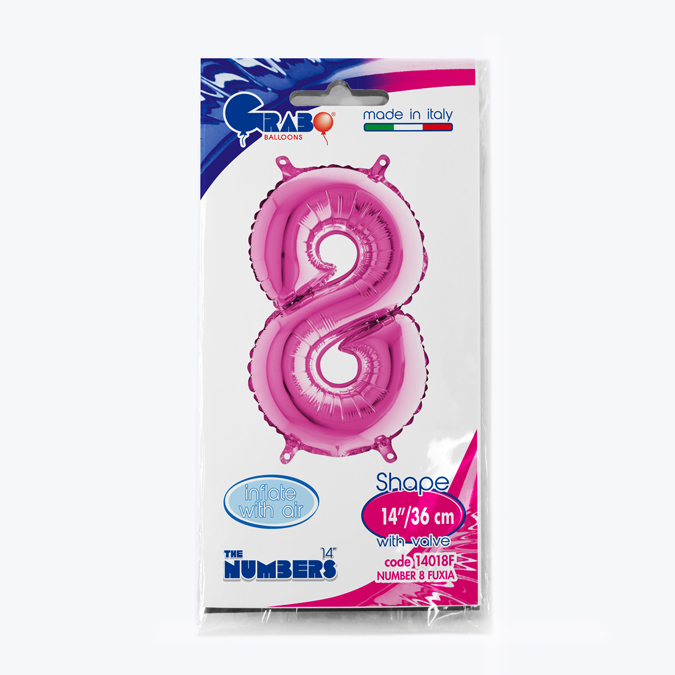 Foil balloon in the shape of the number 8 in fuchsia color.