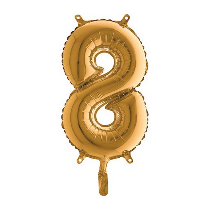 Foil balloon in shape of number 8 in gold color. Balloons are in single pack.