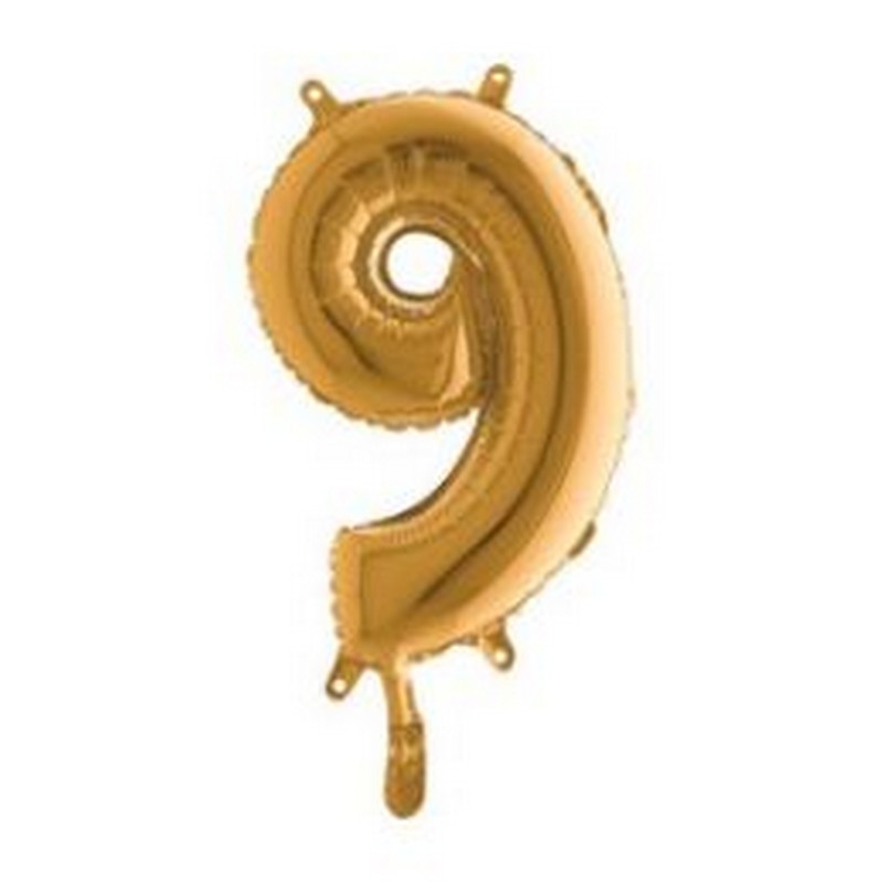 Foil balloon in shape of number 9 in gold color. Balloons are in single pack.