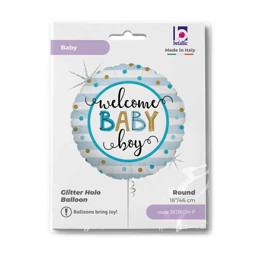Foil balloon in the shape of a circle with the inscription Welcome Baby Boy.