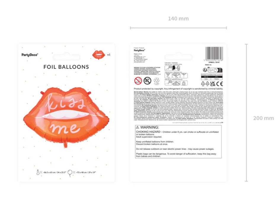 Foil balloon in the shape of a lip, size 86.5x65cm. The balloon is suitable for inflation with both helium and air.