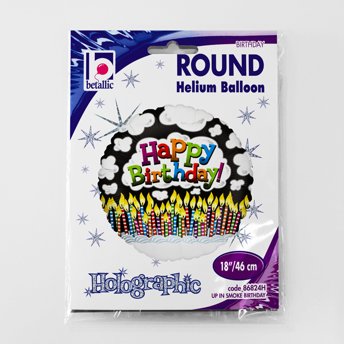 Foil balloon in the shape of a circle with candles and the words Happy Birthday.
