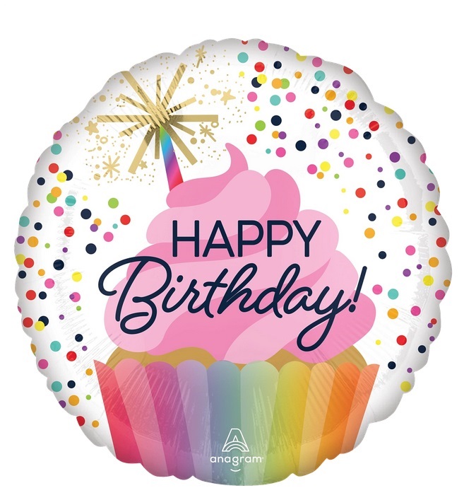 A foil balloon in the shape of a circle with a cake and the inscription Happy Birthday.