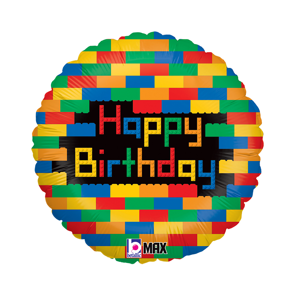 Foil balloon in the shape of a circle with Lego blocks and the inscription Birthday.