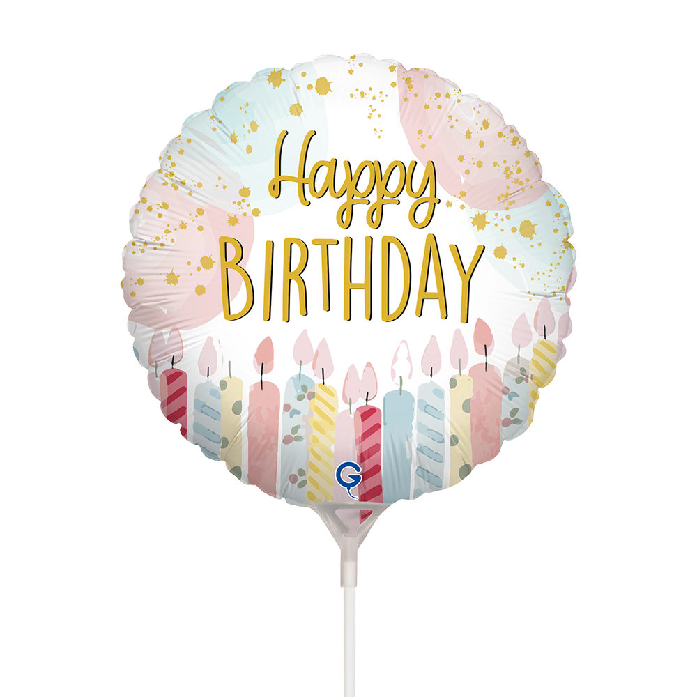 MINI foil balloon in the shape of a circle in pastel colors with candles and with the inscription Happy Birthday.