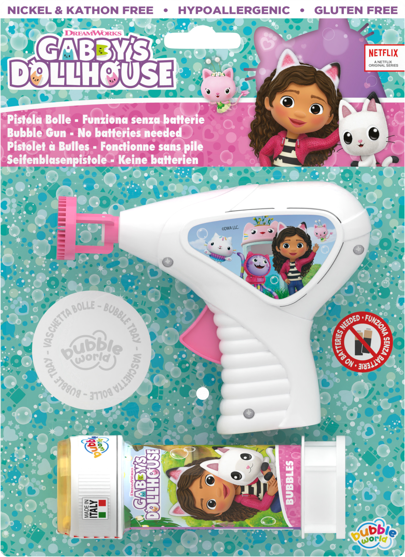Package contains 60ml Bublifuk, Bublifuk Pistol and Bubble Liquid container.