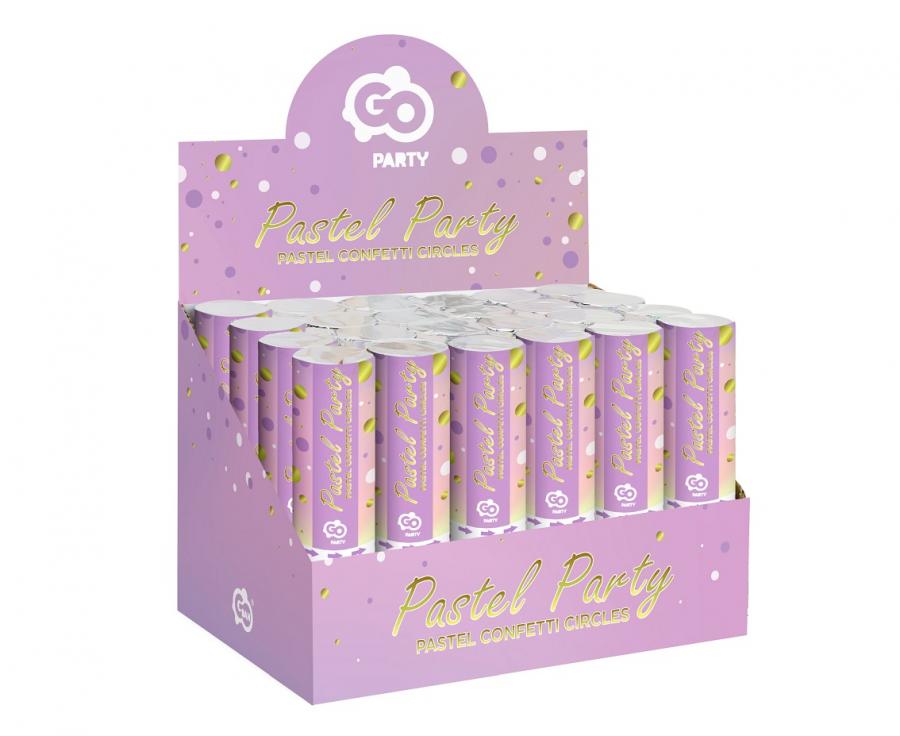 Confetti cannon 15 cm large with pastel wheels.
