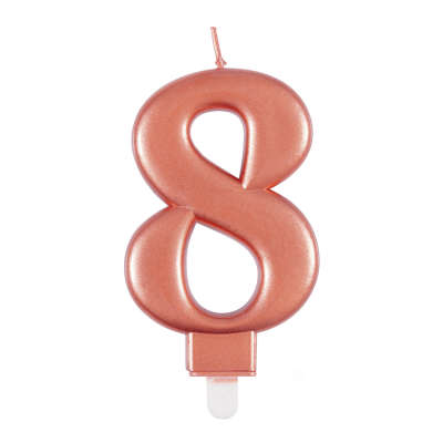 Metallic candle in shape of number 8 in rosegold color.