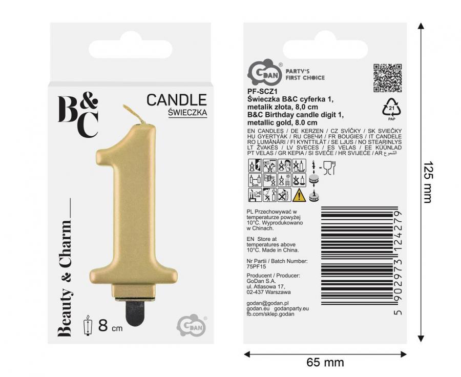 A candle in the shape of the number 1 in gold metallic color.
