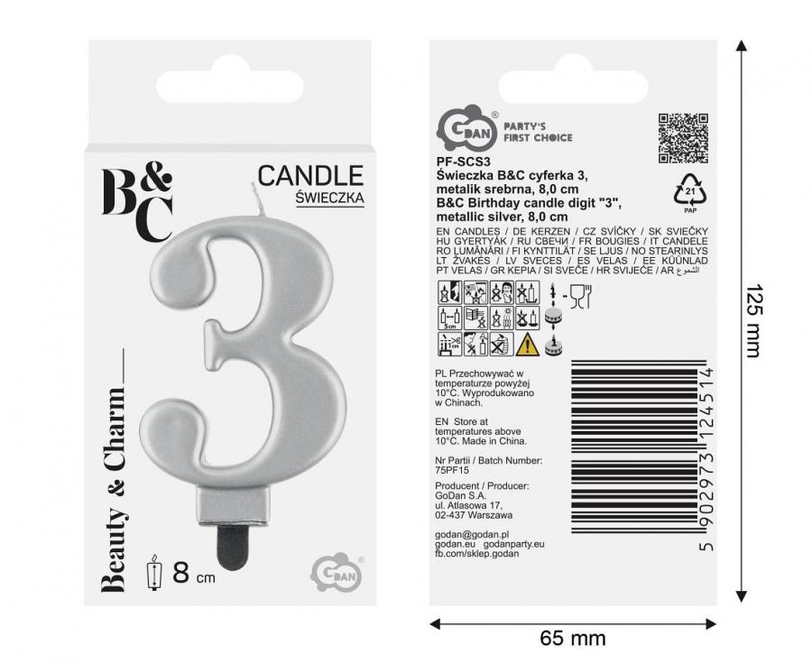Candle in the shape of a number in silver color, size 8cm.