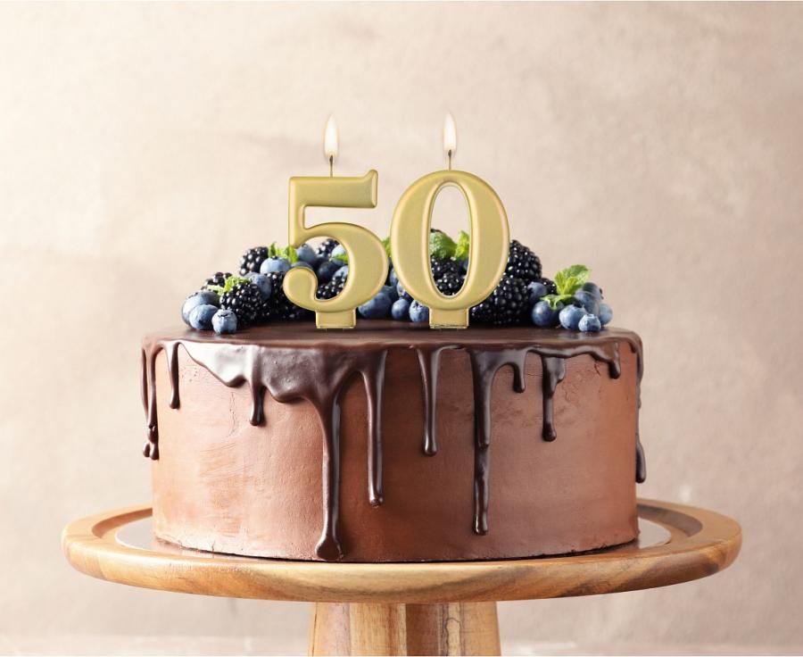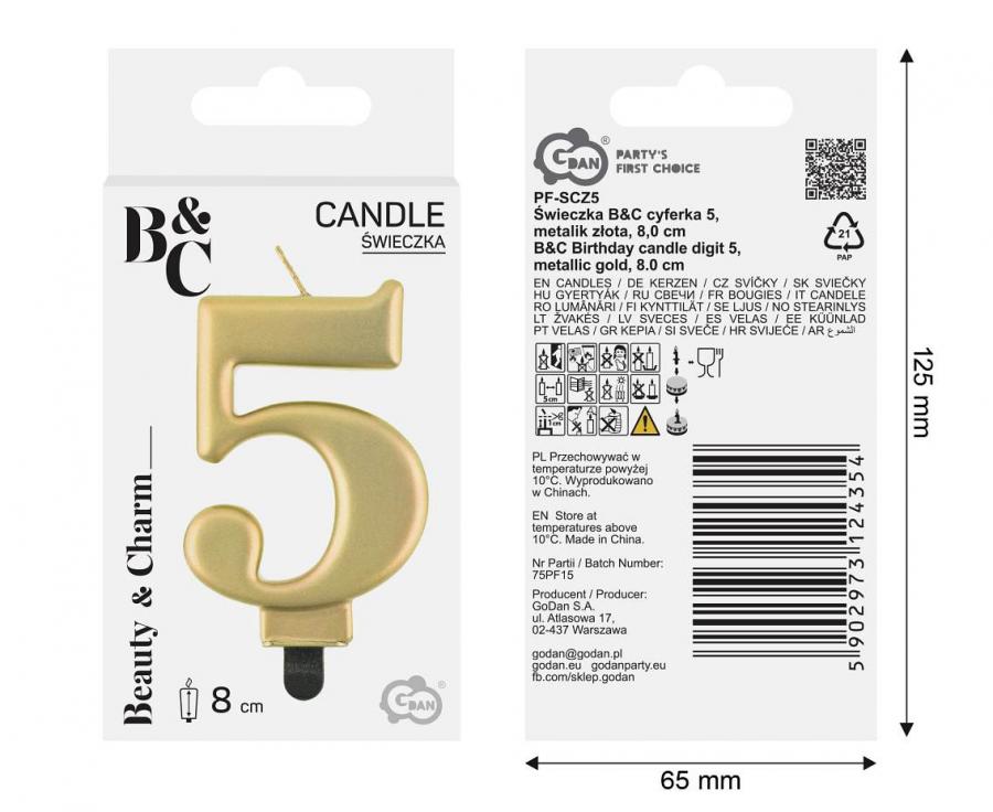A candle in the shape of the number 5 in gold metallic color.