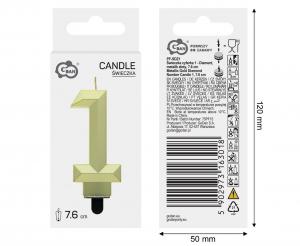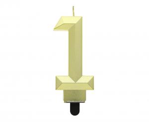 A candle in the shape of the number 1 in gold color.