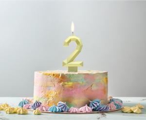 A candle in the shape of a number 2 in gold color.
