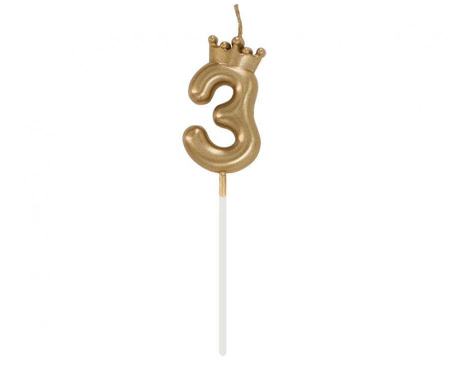 A candle in the shape of the number 3, decorated with a golden crown.