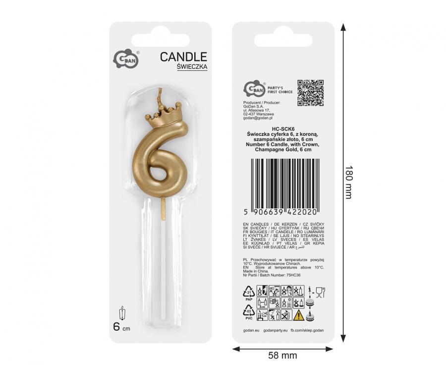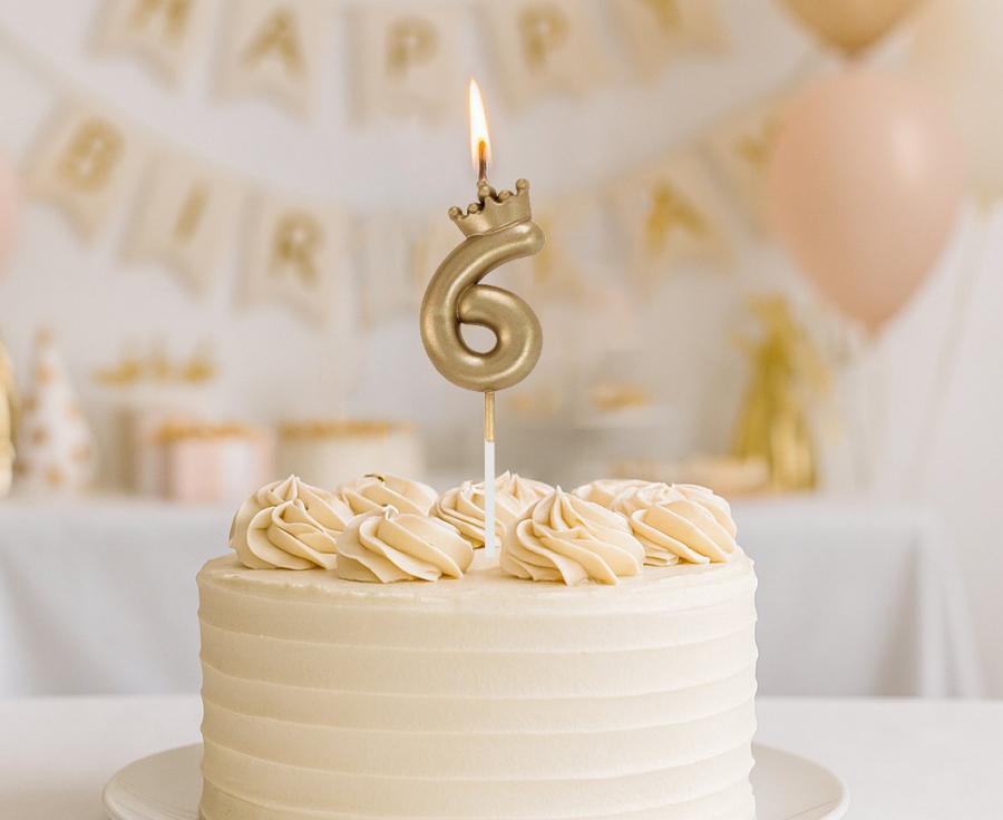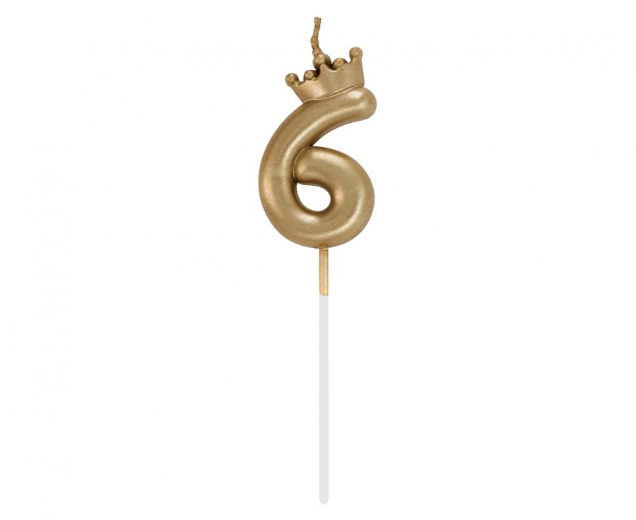 A candle in the shape of a number 6, decorated with a golden crown.