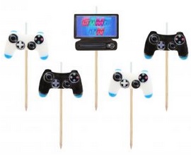 set of five pieces of candles with the motif of computer games.
