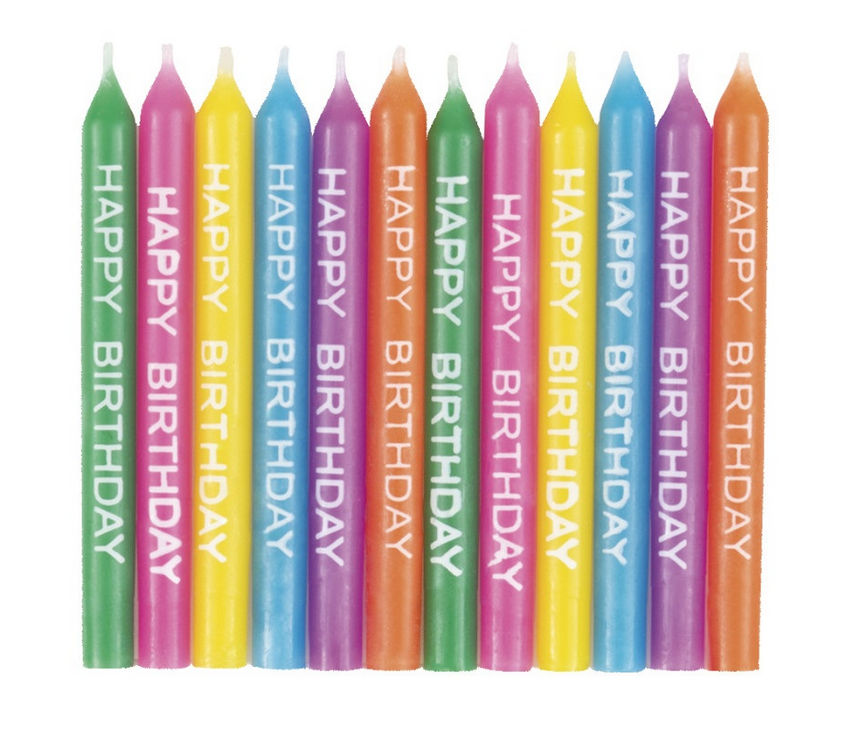 Colorful cake candles with a white Happy birthday print, 6 cm tall.