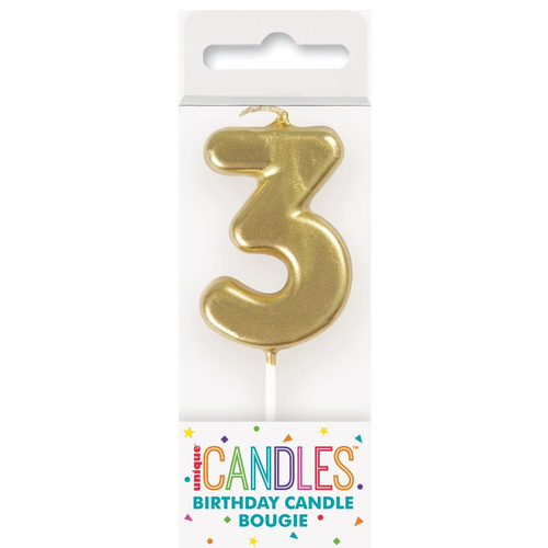 Candle in shape of number 3 in gold color, 5cm long.