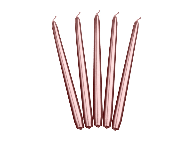 Long narrow metallic candle in rose gold color, length is 24cm.