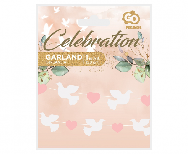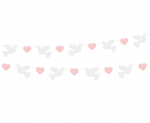 A paper garland depicting doves in white (10x8 cm) and hearts in pink (5x4 cm) is double-sided.