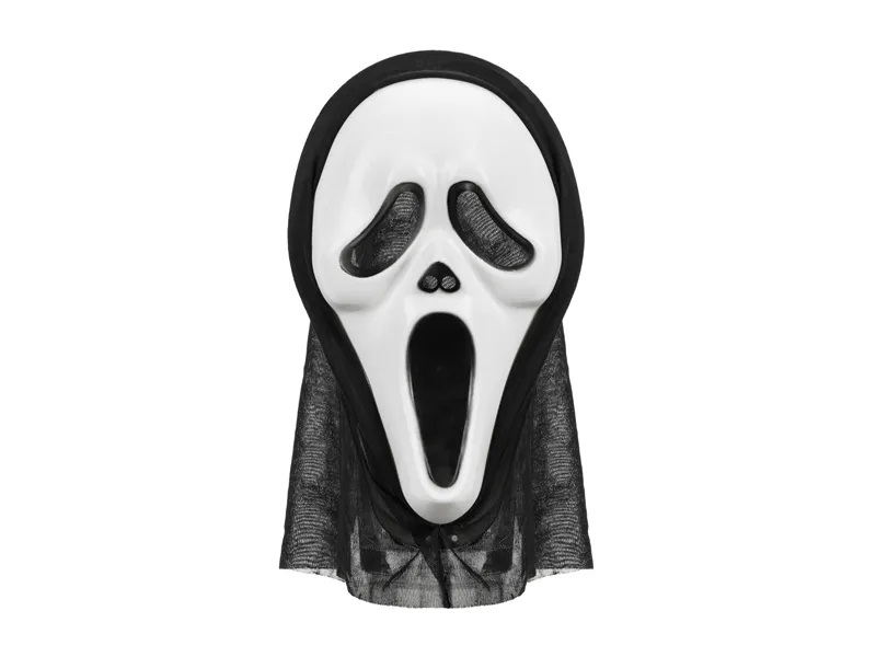 Halloween mask with hood in white and black color, dimensions approx. 18 × 31 cm, hood length approx. 38 cm.