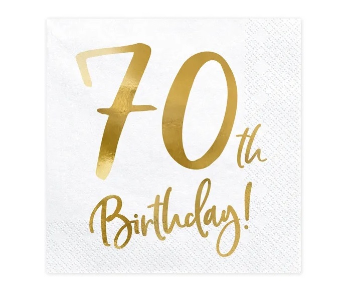 Paper napkins in white with a gold metallic inscription 70th birthday (70th birthday).