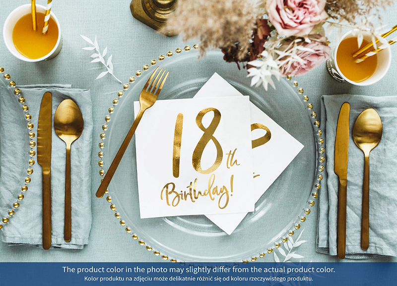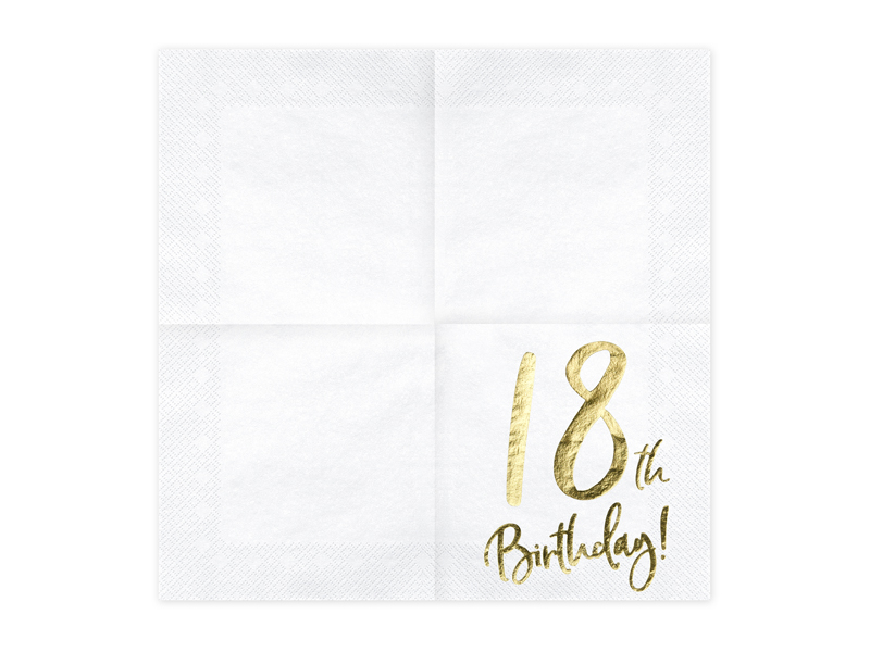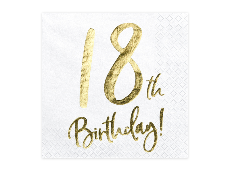 Paper napkins in white color with gold metallic inscription 18th birthday (18th birthday).