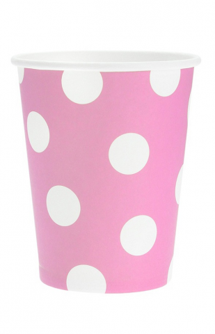 Set of six pink paper cups with white polka dots with a volume of 270ml.
