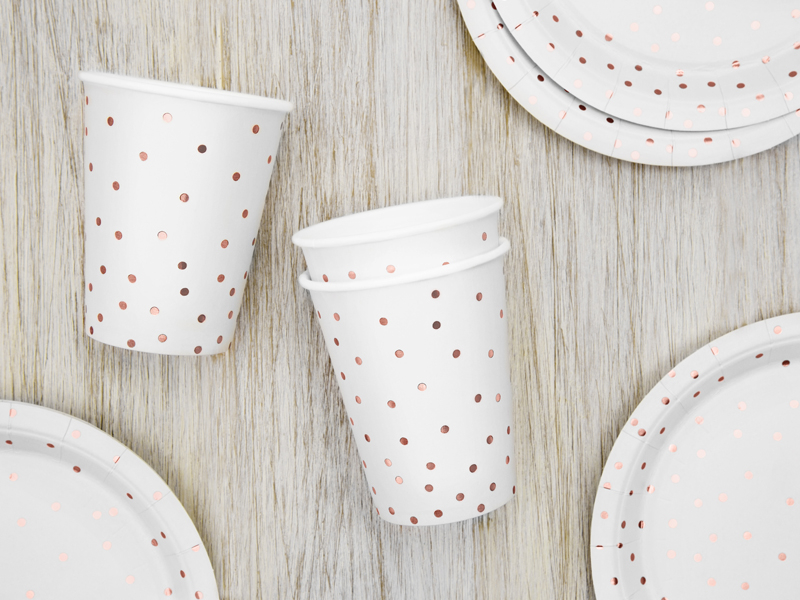ECO paper cups in white with a pink polka dot, the content of the cup is 260ml.