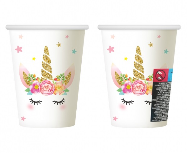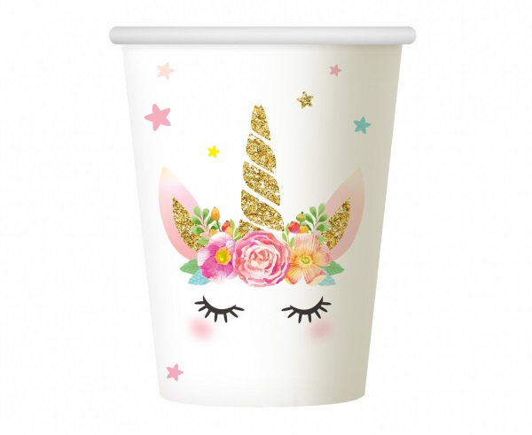 Set of six decorative paper ECO cups with a unicorn motif with a volume of 266ml.